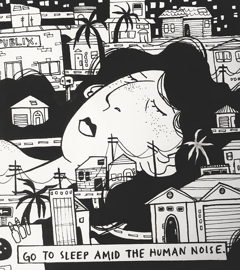 A single panel comic trying to capture the feeling of falling asleep in a quiet Florida town.